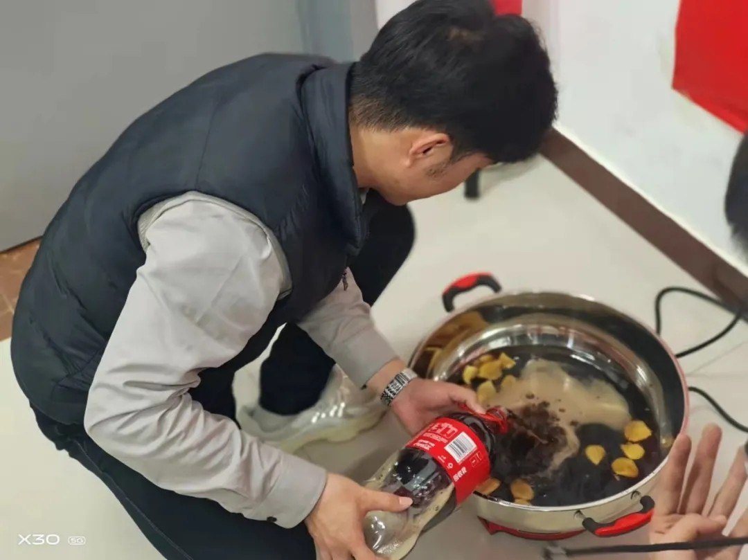 同學(xué)們與老師互相合作一片其樂融融的景象,大家支起了鐵鍋,架起了架臺,切好了姜絲,準(zhǔn)備好了可樂,熬出了一鍋驅(qū)寒暖心的姜絲可樂。