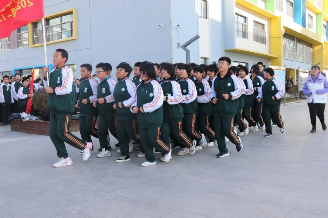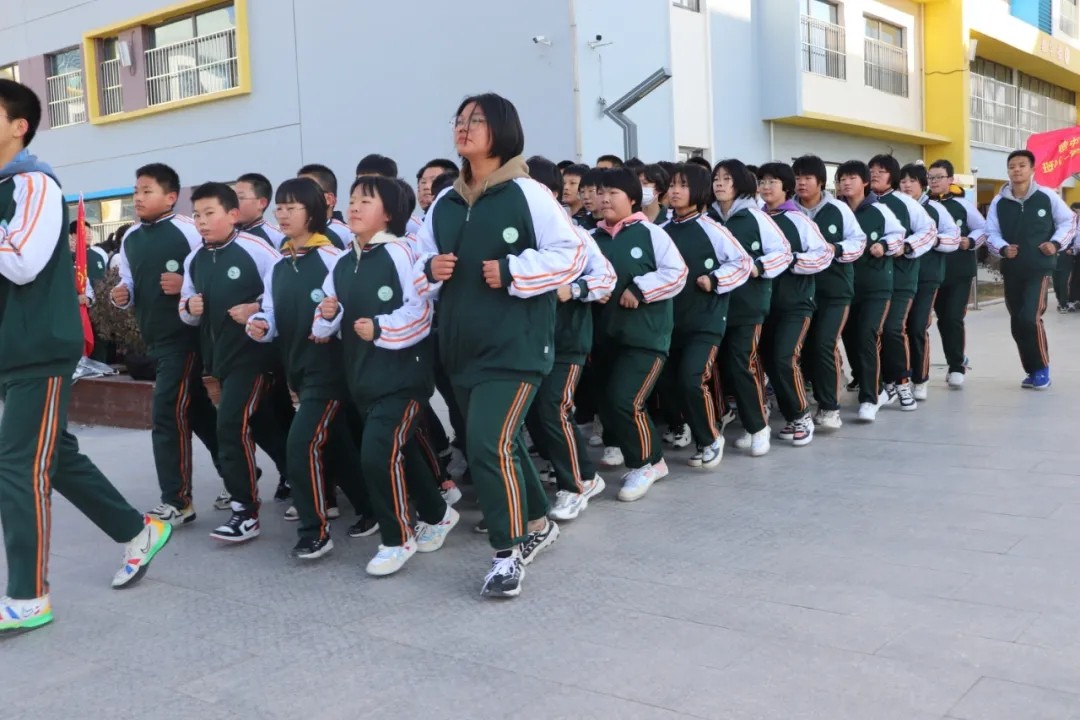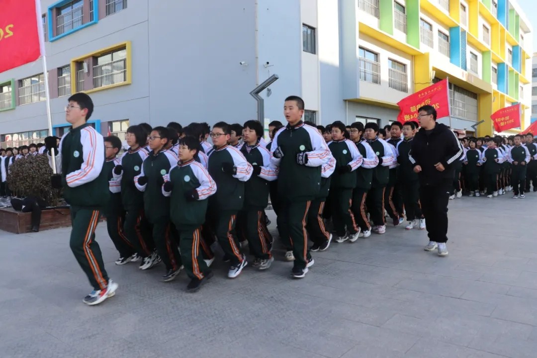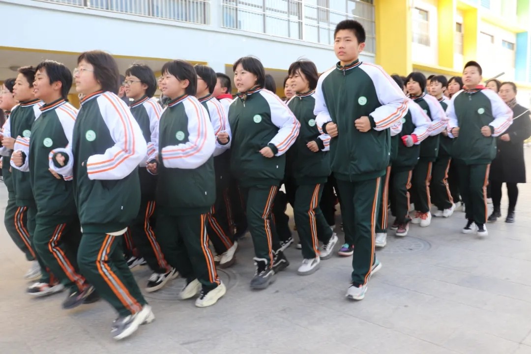 評(píng)委老師就位,他們秉持著公平、公正、公開的原則,為每個(gè)班級(jí)打分?!叭w都有!跑步~走!一二一!一二一!一、二、三、四......“伴隨著大體委體育老師的節(jié)奏,伴隨著響亮的口號(hào),初二15個(gè)班和初一A部16個(gè)班、B部14年級(jí)分別踏著整齊劃一的步伐”原地踏步,跑步走“。