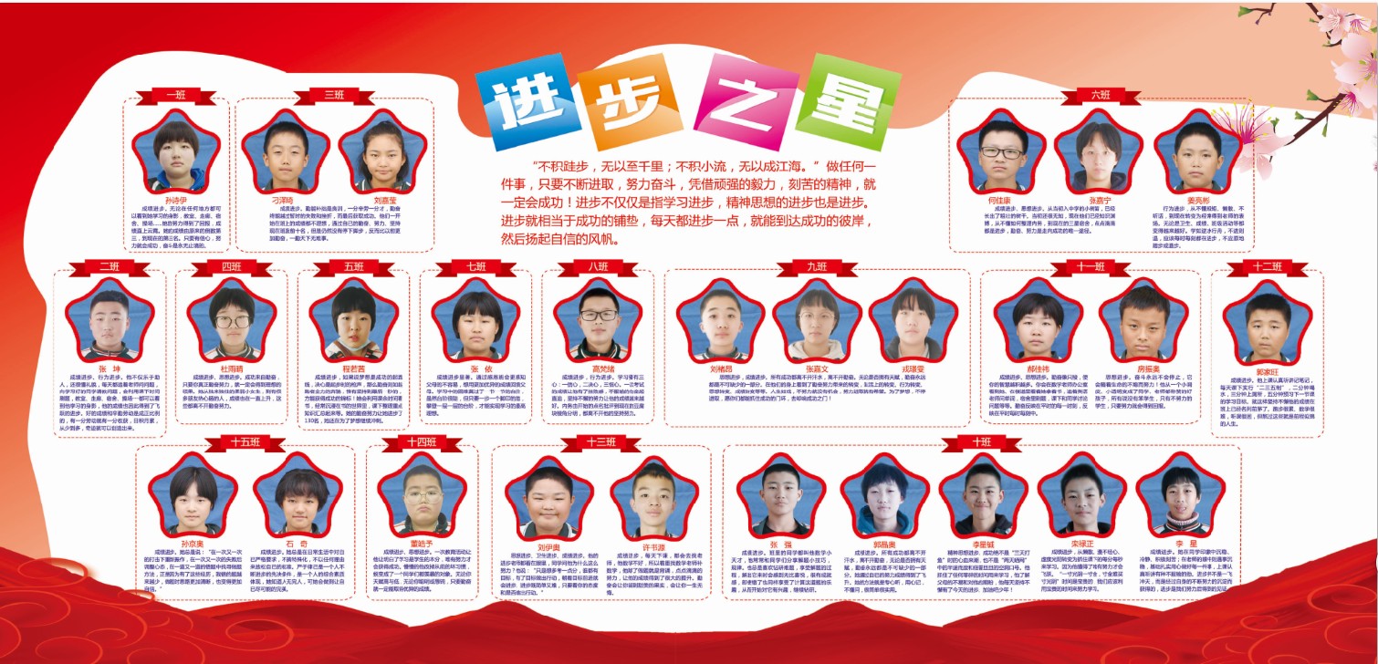 查看詳情 >>八年級(jí)(1)班進(jìn)步之星張朔豪他不斷突破自我,勇于做出改變,提升自己。一分耕耘,一分收獲,他的成績(jī)迅速上升,成為班級(jí)中一道亮眼的風(fēng)景,帶領(lǐng)同學(xué)們共同進(jìn)步。......